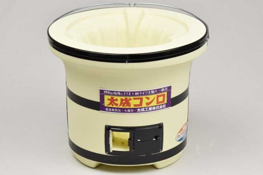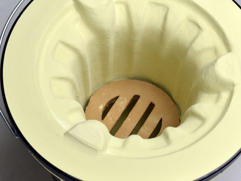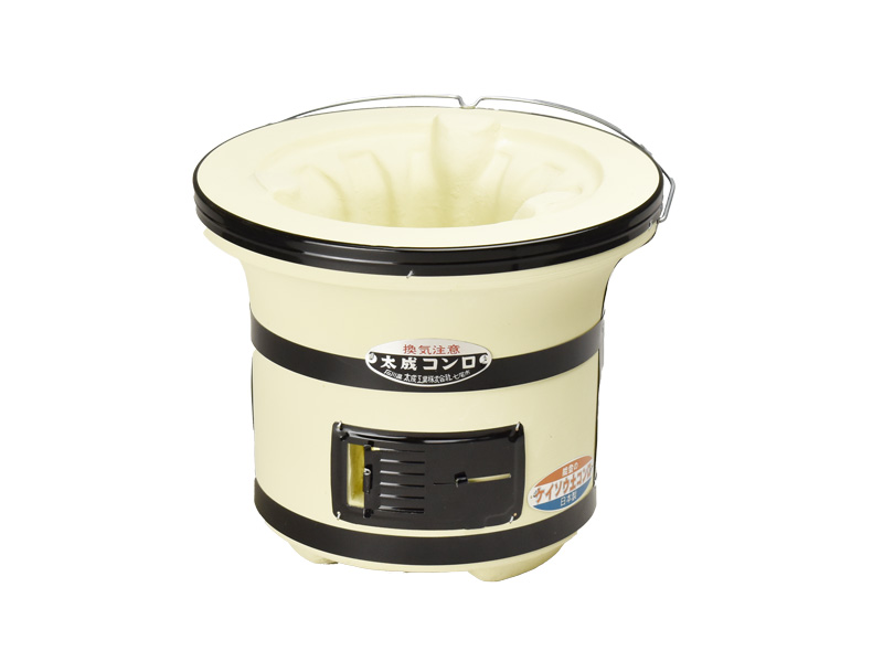地元石川県能登の珪藻土で作られ断熱性・熱効率に優れた木炭コンロの定番商品。本体下部にある通風口で火力の調整が可能。付属品として火皿一枚を同梱しております。持ち手はツル型です。※網は別売りです。